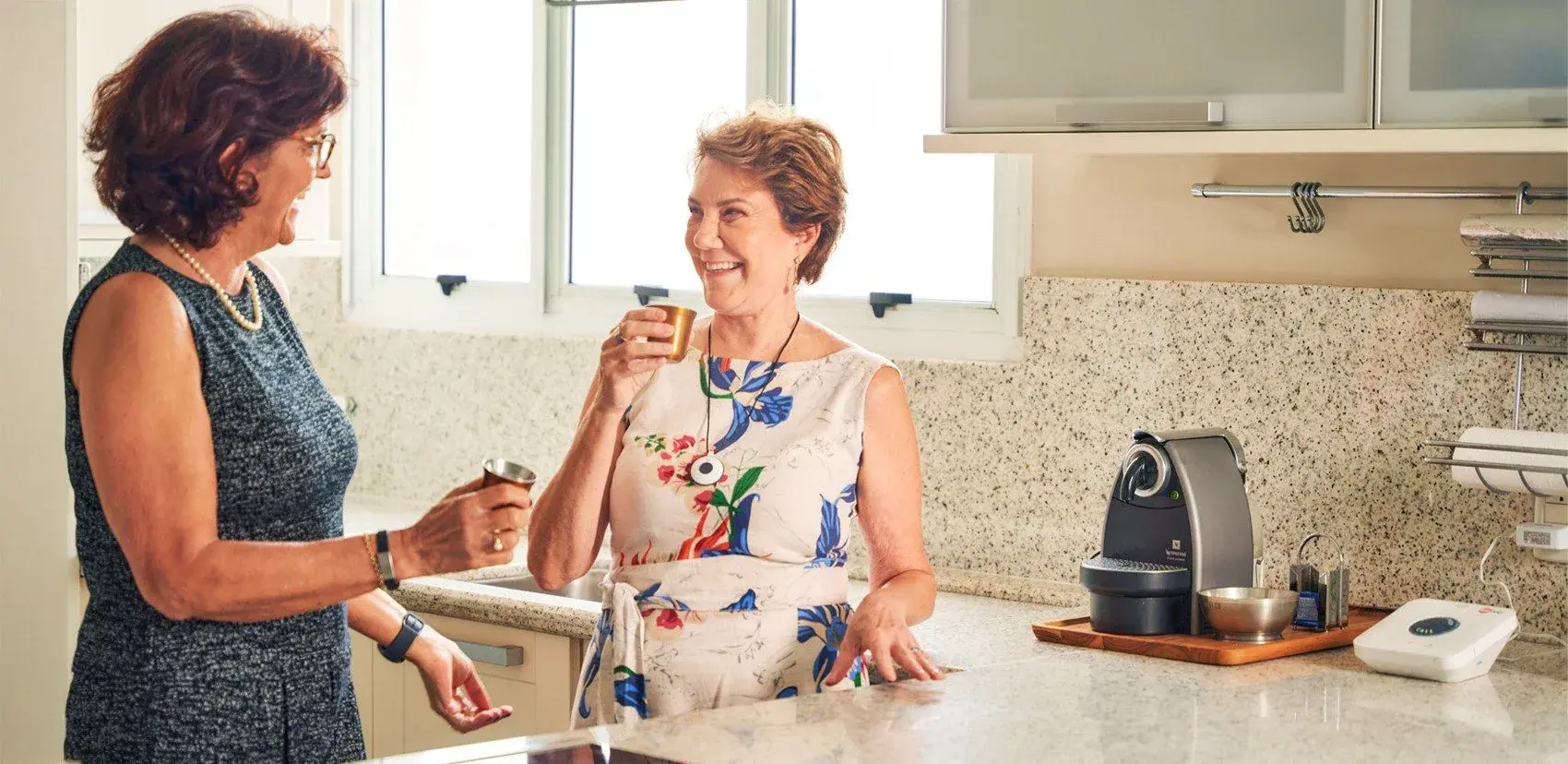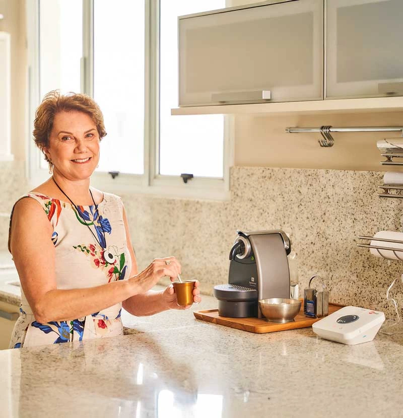 Atualmente, com o botão de emergência da TeleHelp, a Dona Palmyra vive muito mais segura e tranquila, porque tem a certeza de que sempre que precisar de ajuda, ela só precisa apertar um botão.